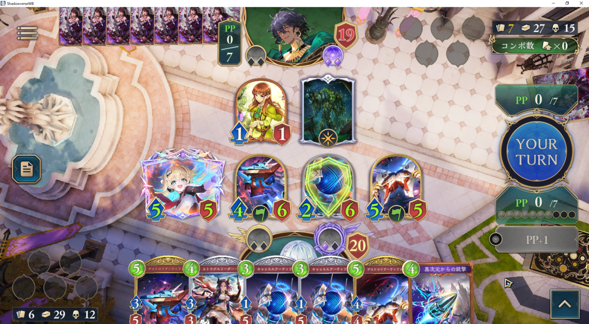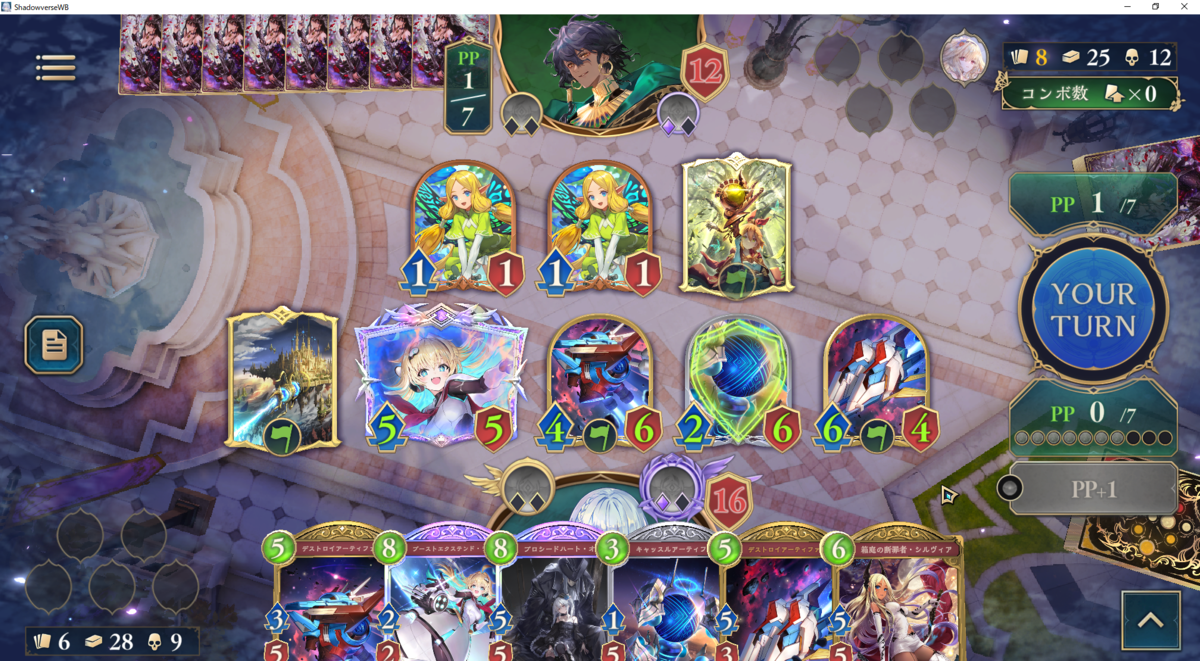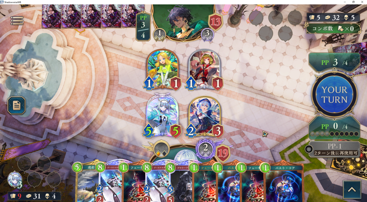 いつクオンやアングレアと共にフレイムデストロイヤーが飛んでくるかわからないので、それらの処理に使えるシルヴィアはプレータイミングを遅らせたいです。ウィッチは手札からの打点に乏しいので盤面に関しては1面程度は放置しても問題ないです。なので、進化権やシルヴィアは無理に使用せずに温存した方がよい場面も多いです。